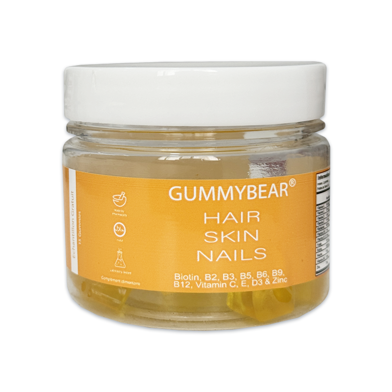 Gummybear Hair Skin Nails est un complément alimentaire qui cible la chute capillaire, favorisant la repousse des cheveux et la santé des ongles. Ce produit est particulièrement riche en biotine, un nutriment essentiel pour la peau.