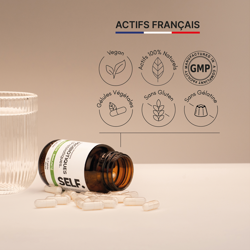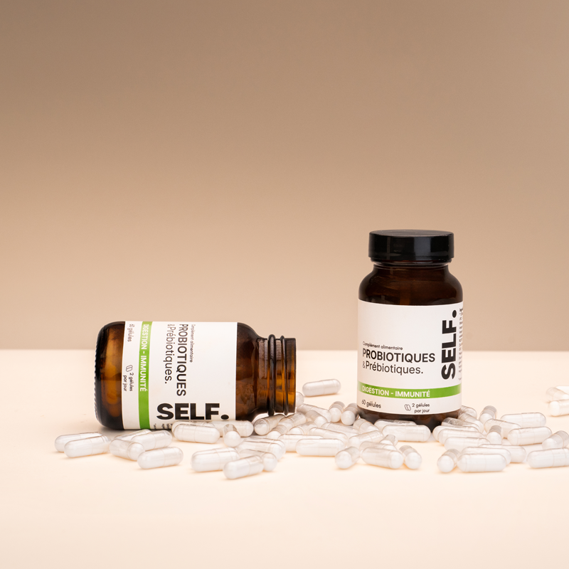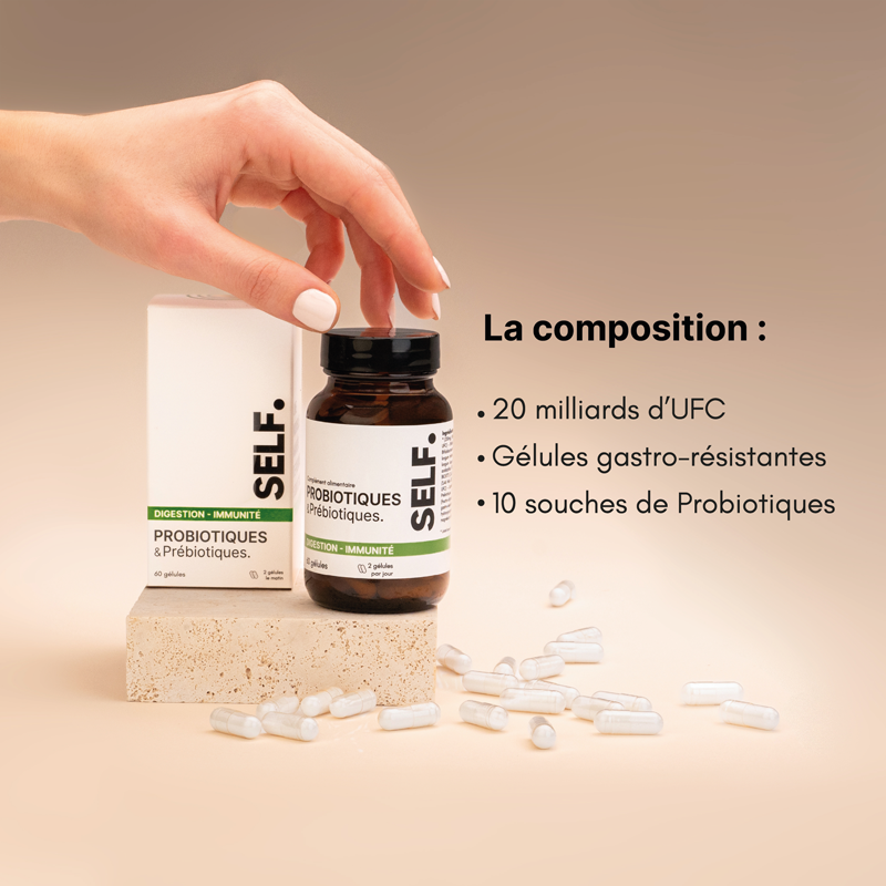 Adapté à un large éventail de besoins : ballonnements, constipation, diarrhée, post-antibiotiques, intolérances alimentaires, troubles hormonaux, stress, acné, psoriasis ; le Self Probiotiques & Prébiotiques agit à 360° sur les systèmes digestif, immunitaire et nerveux. Sa formulation complète permet également d'améliorer la digestion, de réduire l'inflammation et de renforcer les défenses naturelles.