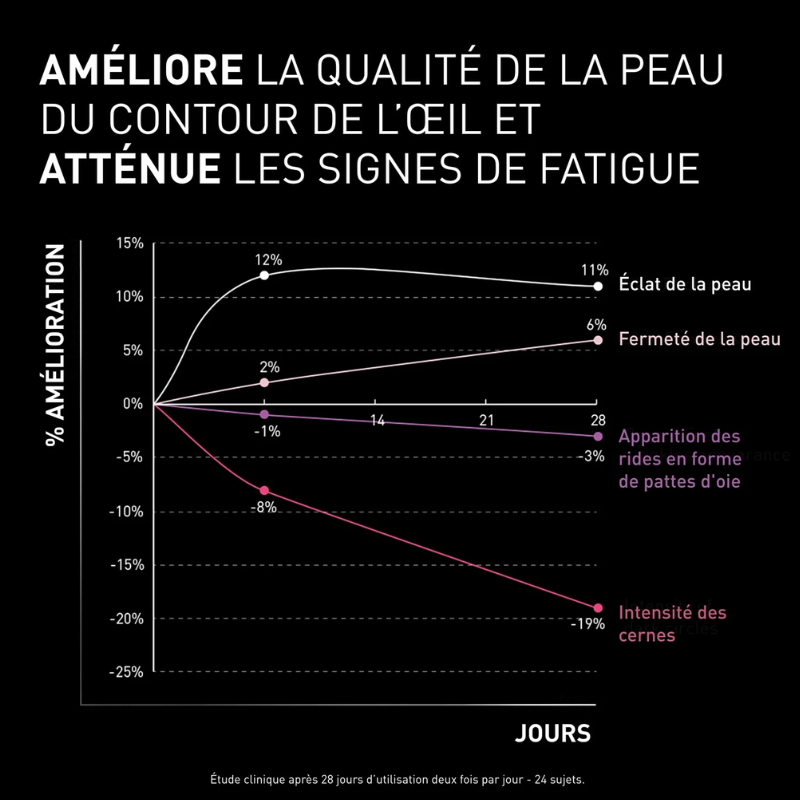Inspirée de la médecine esthétique, sa formule agit globalement sur les signes de fatigue et de vieillissement du regard. Jour après jour, le contour de l’œil paraît plus lisse, plus lumineux et reposé, pour un regard visiblement revitalisé.